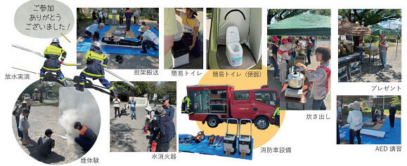 簡易トイレ、担架搬送、 煙、水消火器、炊き出しなど