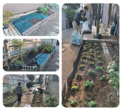 また、11 月 8 日に千葉市よりパンジー 25 苗、ビオラ 20 苗、ノースポール 20 苗の花苗をいただき、新たな植え付けを行いました。従来は花壇回りの除草が必要でしたが、5 月の除草作業後に設置した防草シートのお陰で今回は除草作業はなしでした。 皆様、ぜひ会館にお越しいただき、リニューアルした花壇をお楽しみください! ( 環境衛生部 )