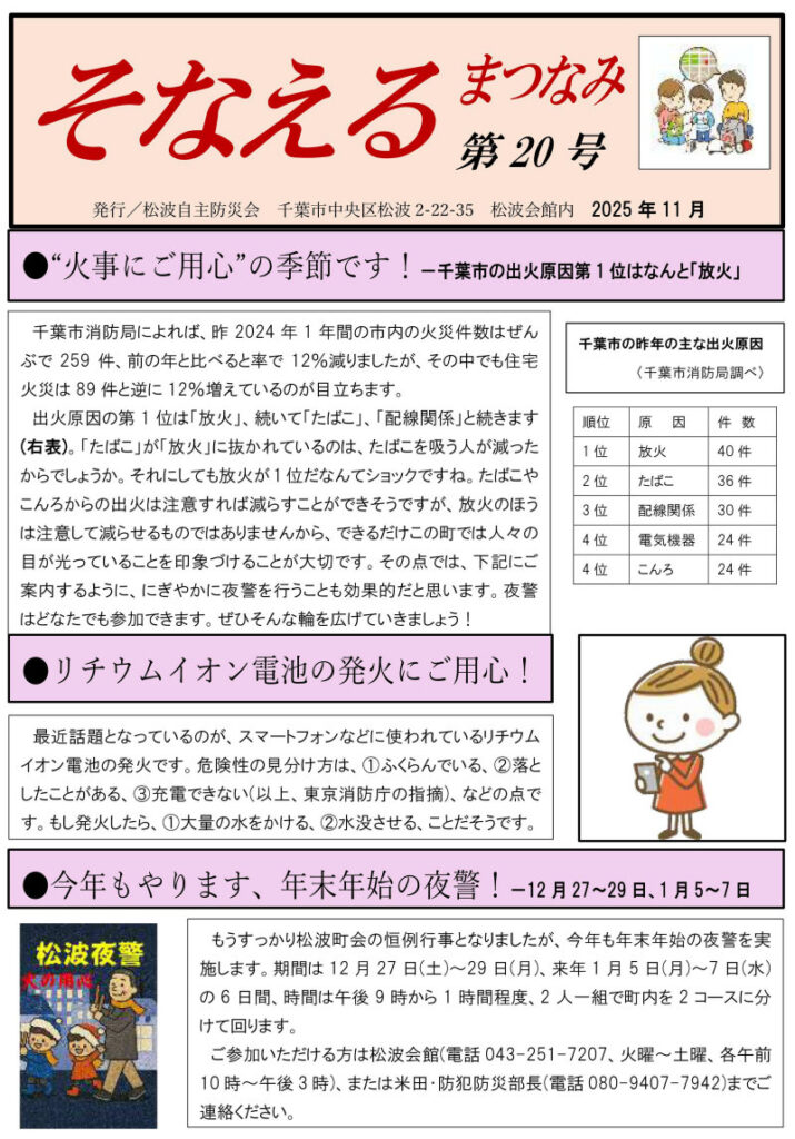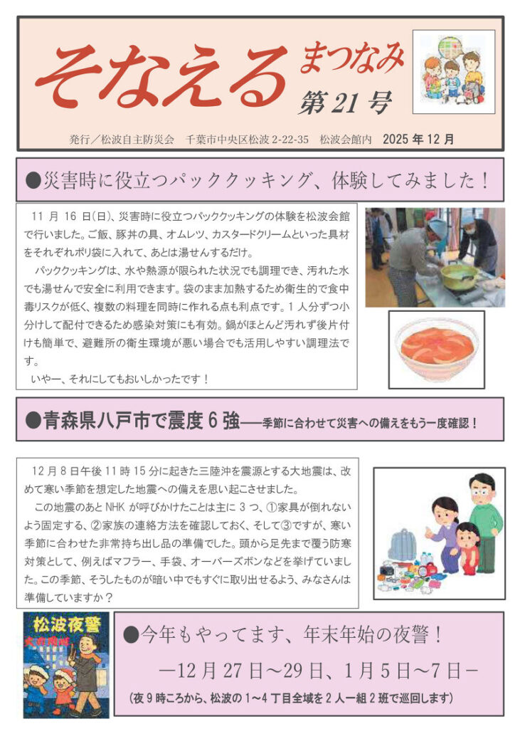 松波町会月行事予定表の右側に「そなえる」を掲載するようになってから、18 回が過ぎました。防災訓練、防災チャット、防災マニュアル防災マップなどに加え、皆さんのお役に立っていることと思います。そして、災害時に役立つ料理教室は今年 6 回目をむかえます。