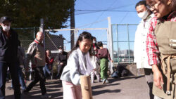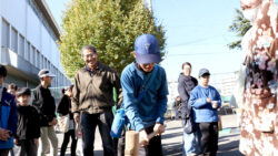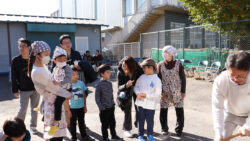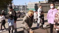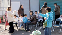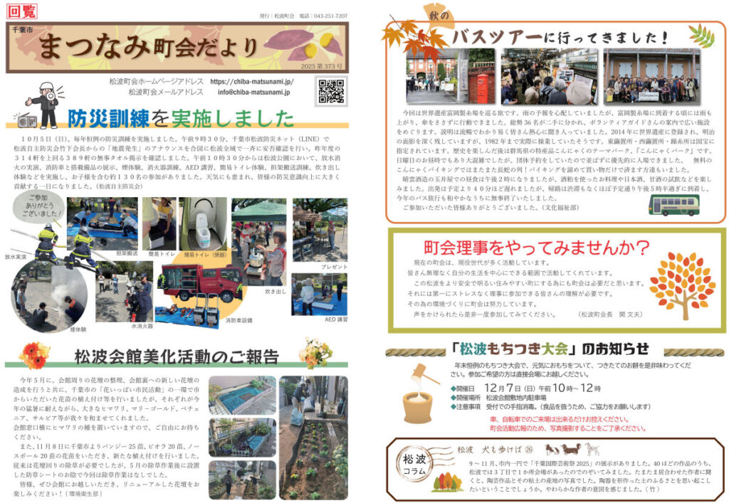 10月5日(日)、毎年恒例の防災訓練を実施しました。午前9時30分、千葉市松波防災ネット(LINE)で松波自主防災会竹下会長からの「地震発生」のアナウンスを合図に松波全域で一斉に安否確認を行い、昨年度の314軒を上回る389軒の無事タオル掲示を確認しました。午前10時30分からは松波公園において、放水消火の実演、消防車と搭載備品の展示、煙体験、消火器訓練、AED 講習、簡易トイレ体験、担架搬送訓練、炊き出し