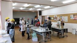 11 月 16 日、社会福祉協議会松波地区部会の方々に教わり、ポリ袋を使った「パッククッキング」をしました。メニューは、ご飯、豚丼の具、オムレツ ( チーズ入り )、カスタードクリームです。温かい丼ものとふわふわのオムレツは、災害時、空腹を満たしてくれて元気が出ますね。さらに甘いカスタードクリームがあったらホッとしませんか?