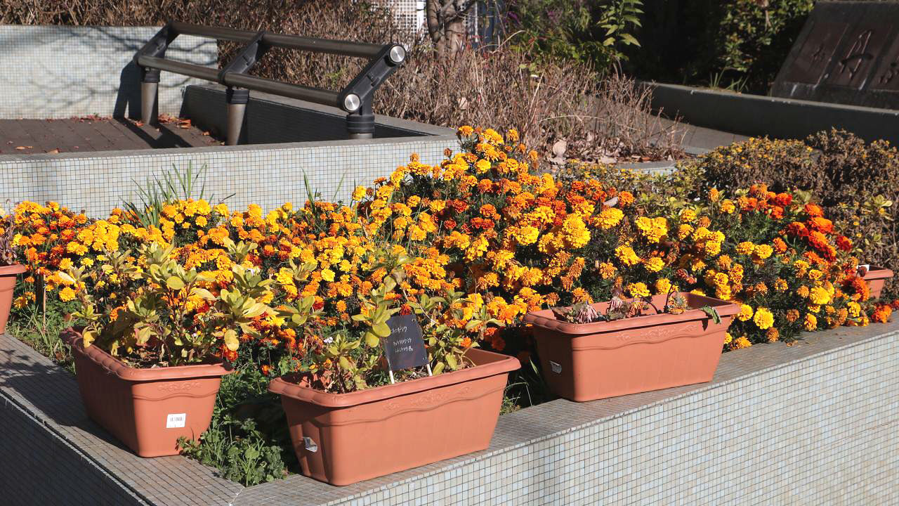 また、11 月 8 日に千葉市よりパンジー 25 苗、ビオラ 20 苗、ノースポール 20 苗の花苗をいただき、新たな植え付けを行いました。従来は花壇回りの除草が必要でしたが、5 月の除草作業後に設置した防草シートのお陰で今回は除草作業はなしでした。 皆様、ぜひ会館にお越しいただき、リニューアルした花壇をお楽しみください! ( 環境衛生部 )