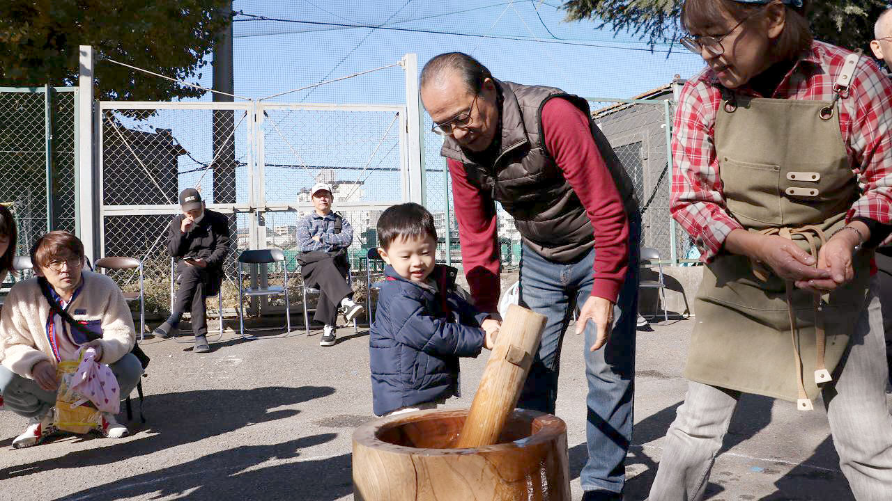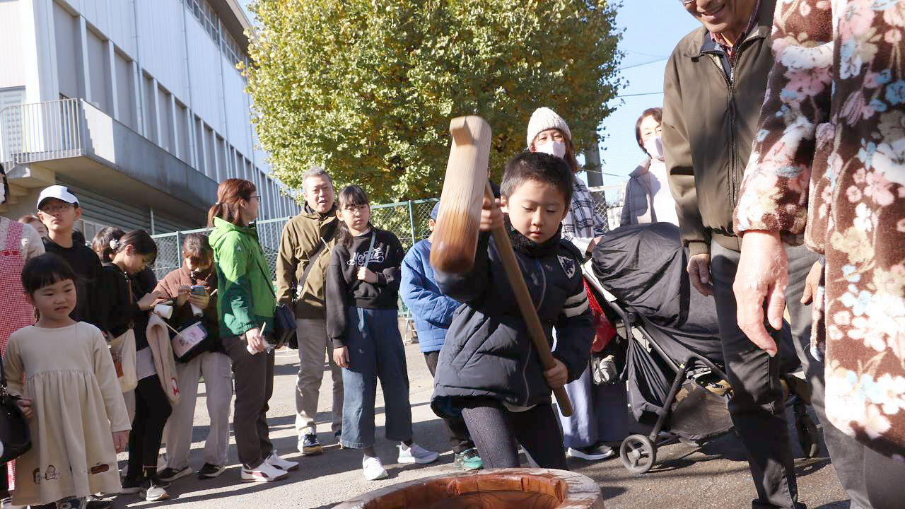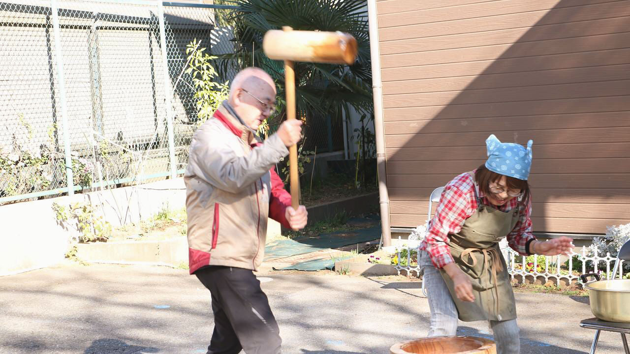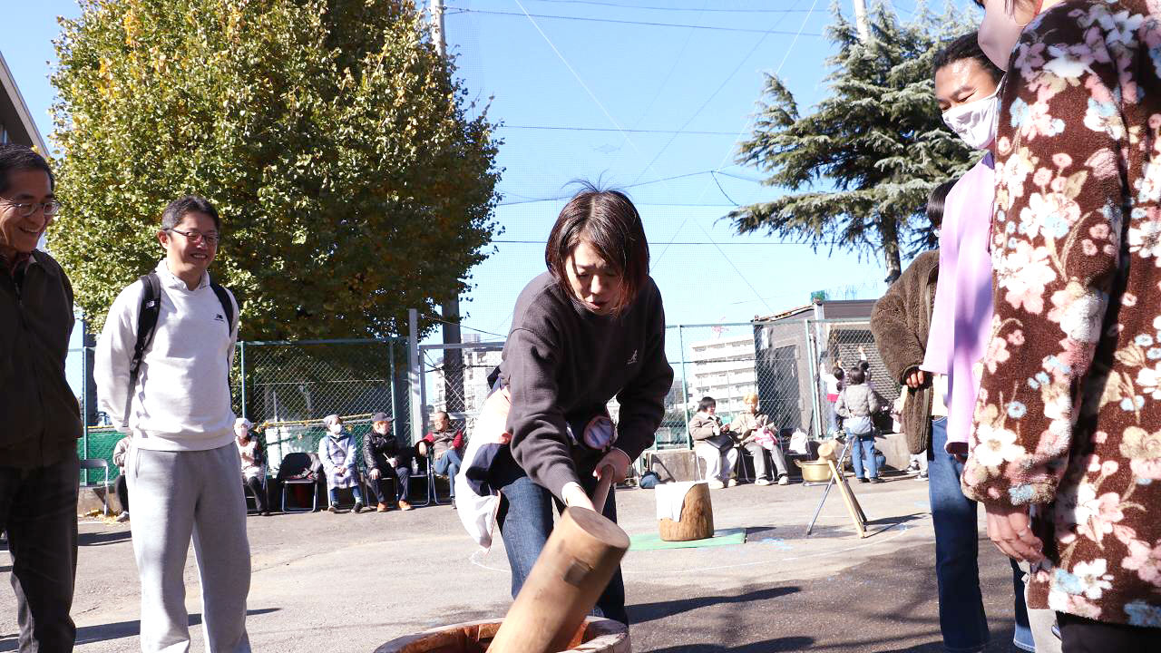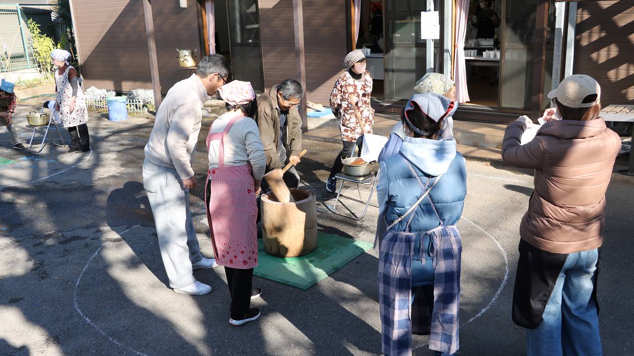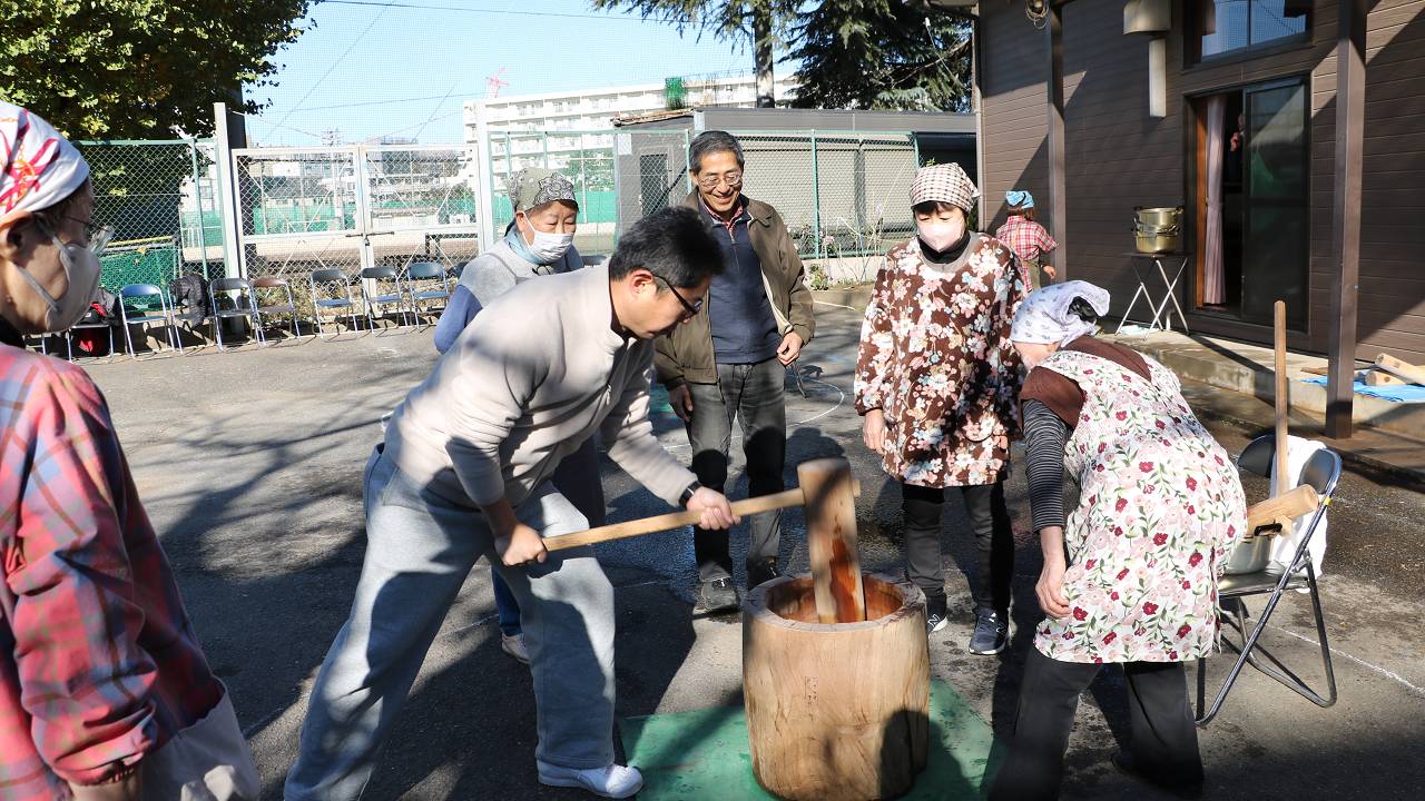 年末恒例のもちつき大会で、 元気におもちをついて、 つきたてのお餅を是非味わってくだ