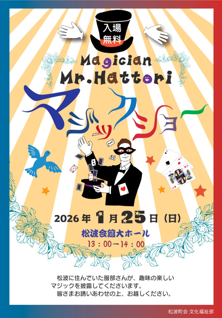 松波に住んでいた服部さんが、趣味の楽しいマジックを披露してくださいます。皆さまお誘いあわせの上、お越しください。