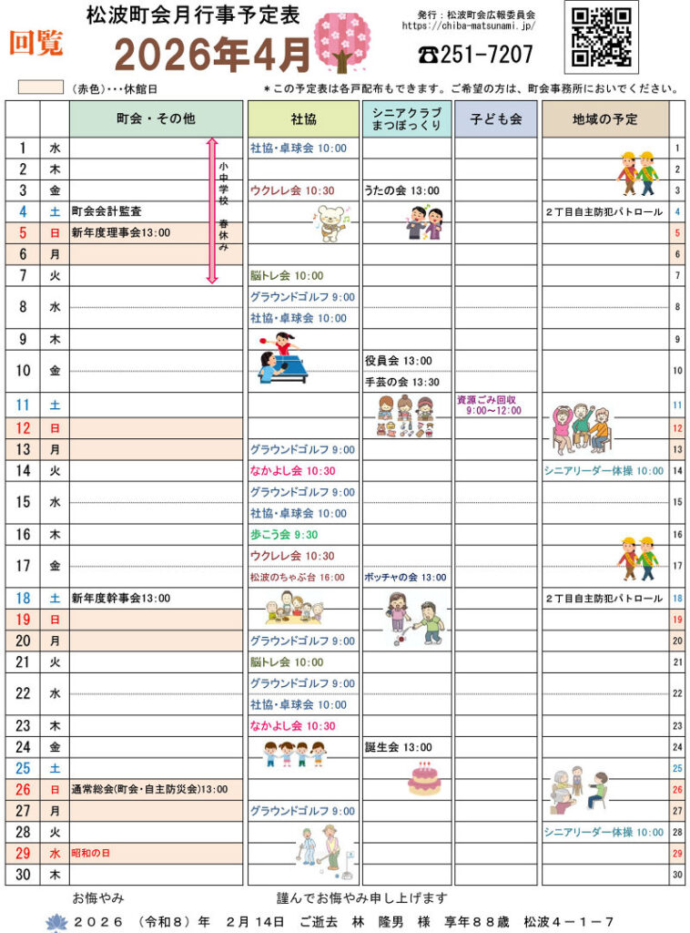 | 5月 | 町会総会、自主防災会総会、松波公園花壇植栽、定例理事会 |